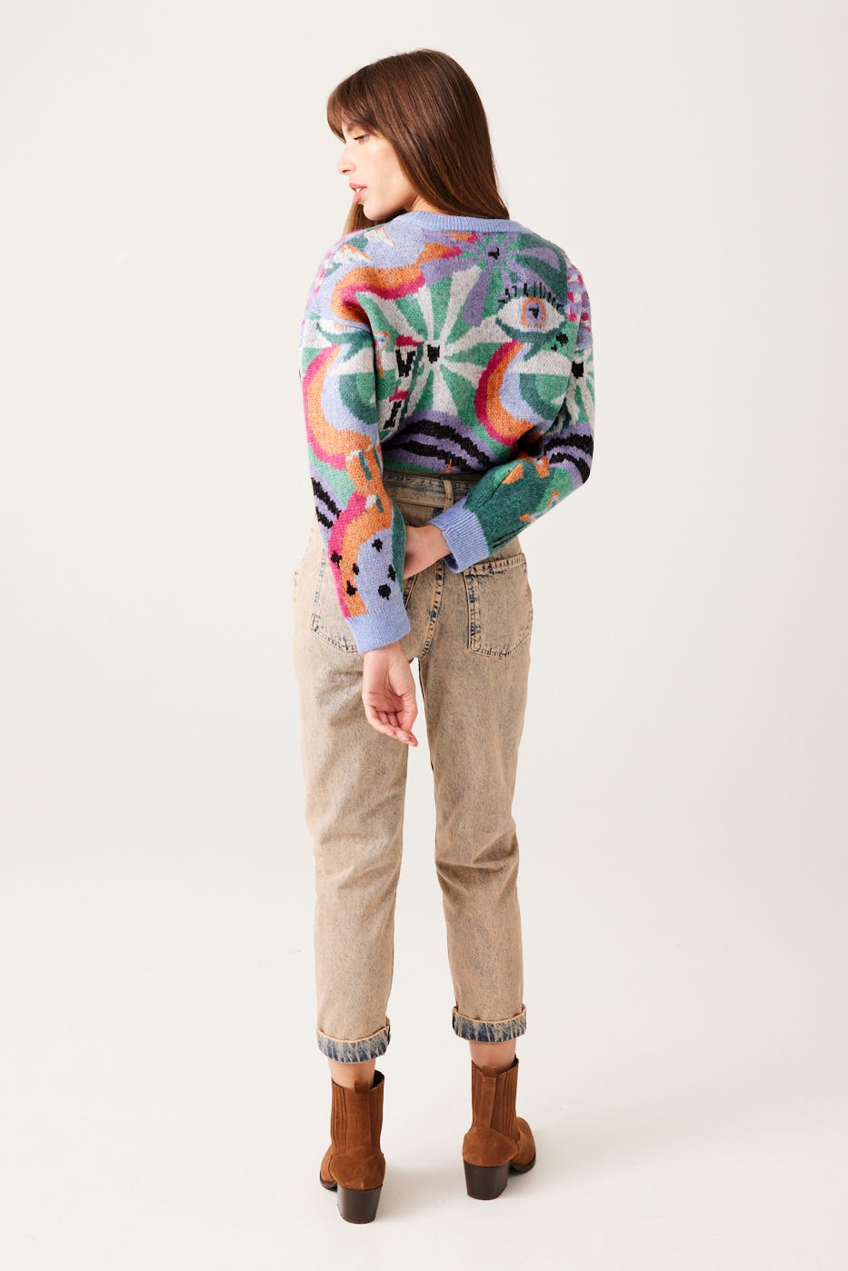 Maglia girocollo con disegni jacquard divertenti, allegri e colorati in morbido filato a lavorazione fitta, linea oversize, giromanica basso, manica lunga, fondo dritto e bordi a coste. Articolo contenente fibre riciclate. Ricavate dai tessuti o dalla plastica oggetto di raccolta, le fibre riciclate vengono riutilizzate per creare nuovi capi.