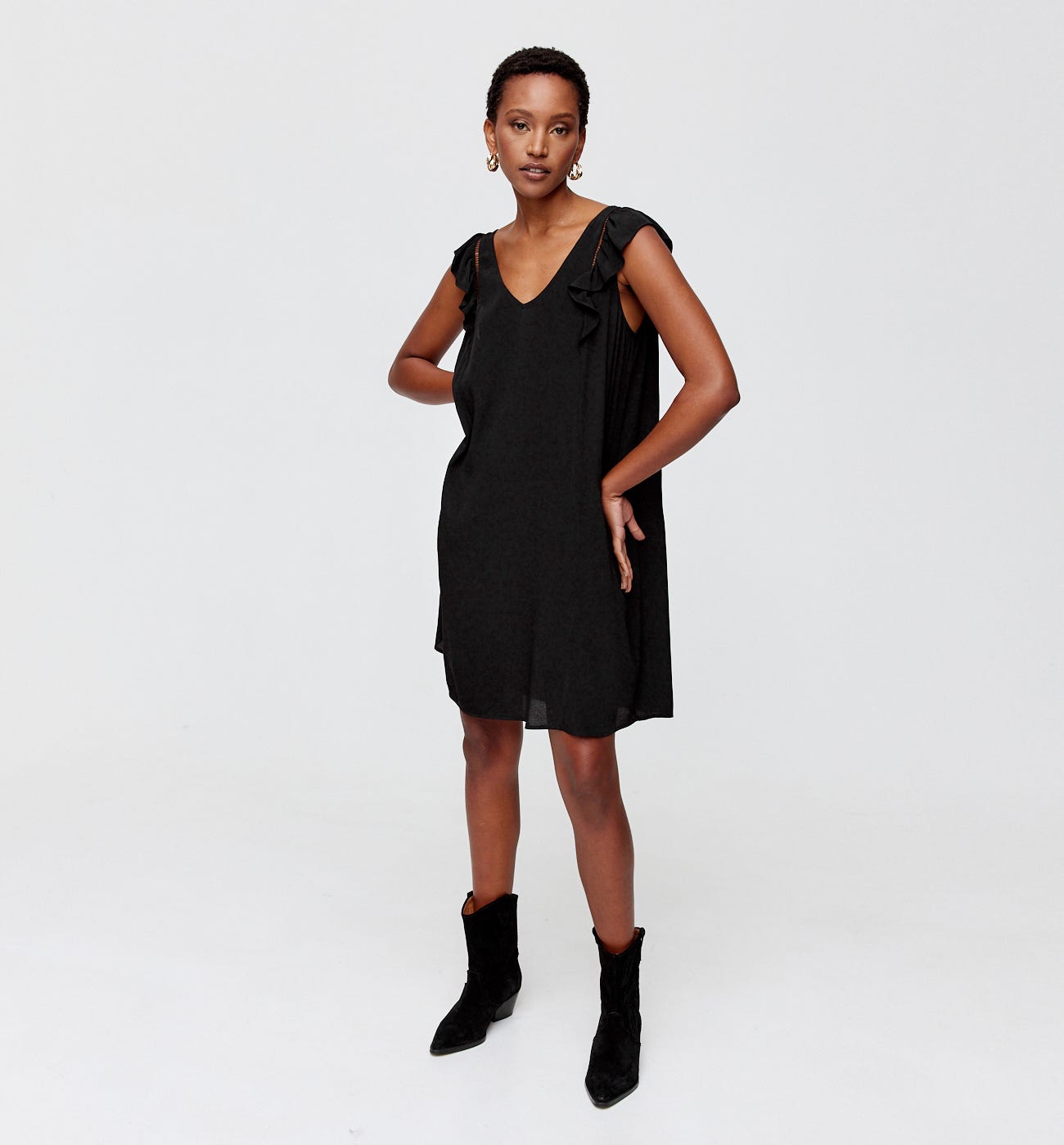 SOLE D'INVERNO. Questo capo è stato pensato per chi ha intenzione di partire verso destinazioni assolate! Semplicità e qualche dettaglio per cambiare tutto: piccoli volant e punto quadro conferiscono un tocco particolare a questo abito corto e svasato in tessuto leggermente increspato. Scollo a V davanti e dietro. Fondo leggermente stondato. Finiture cucite.