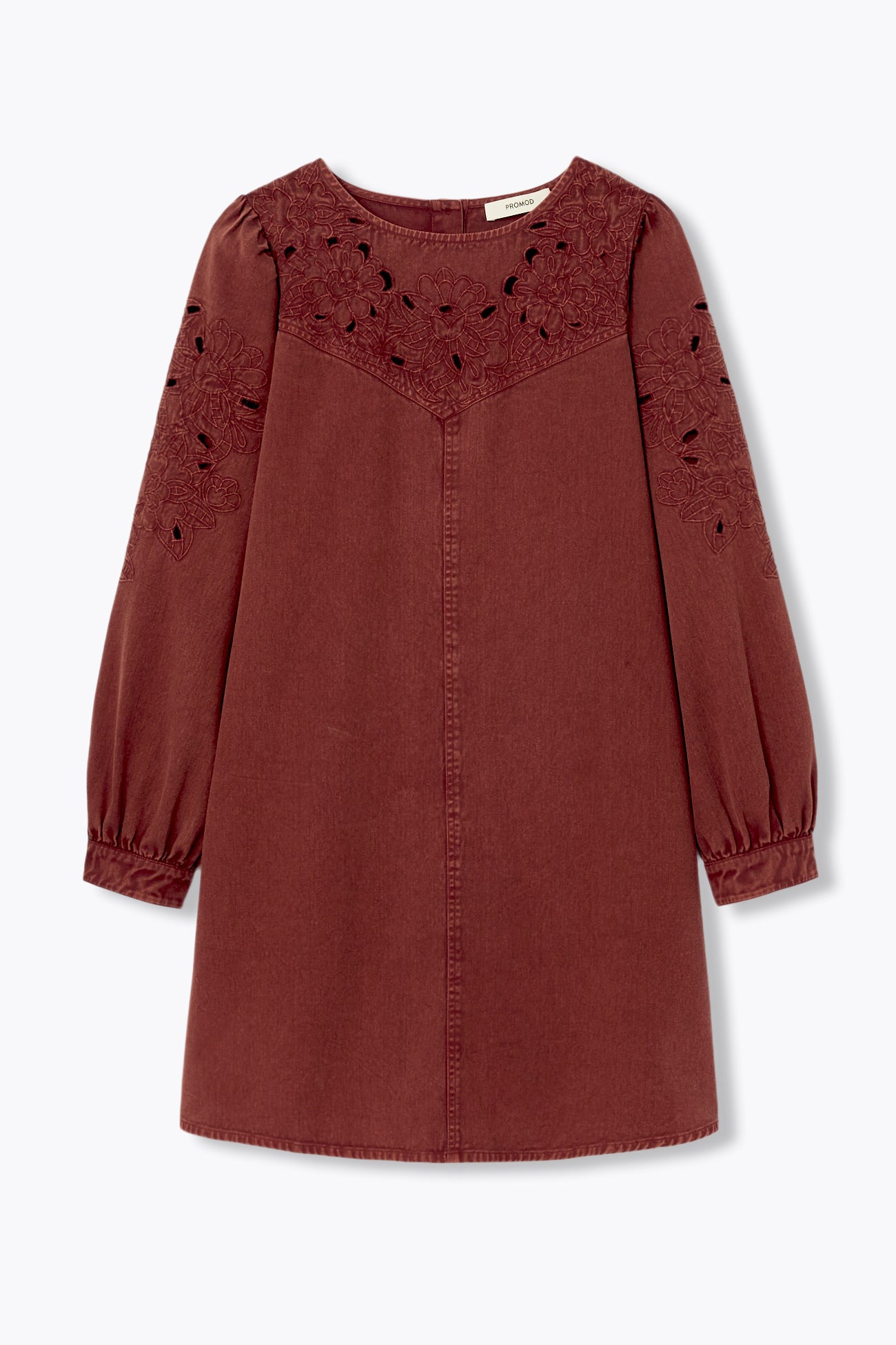 I ricami traforati conferiscono un tocco di originalità a questo abito in denim di cotone tinto in capo dalla vestibilità ampia e corta, colletto tondo, chiusura con bottone sul retro, manica lunga arricciata in alto, polsino con bottone e fondo leggermente stondato. Contiene cotone biologico, coltivato senza pesticidi, fertilizzanti chimici né OGM, al fine di preservare la biodiversità.
