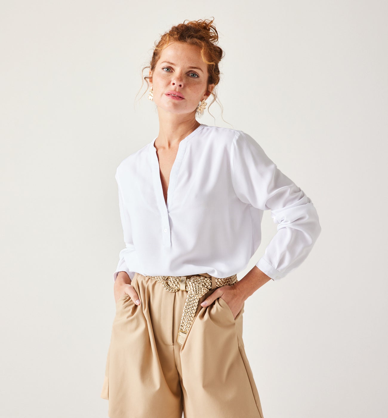 Questa blusa basic apre un mondo di possibilità di stile! Indossala blusante con un paio di pantaloni a vita alta, abbinala agli shorts o accessoriala con bijoux e una borsa a mano. Linea dritta. Colletto alla tunisina. Manica lunga e polsino con bottone. Articolo contenente viscosa ecosostenibile, morbida e fluente ricavata dalla pasta di legno proveniente da foreste correttamente gestite.