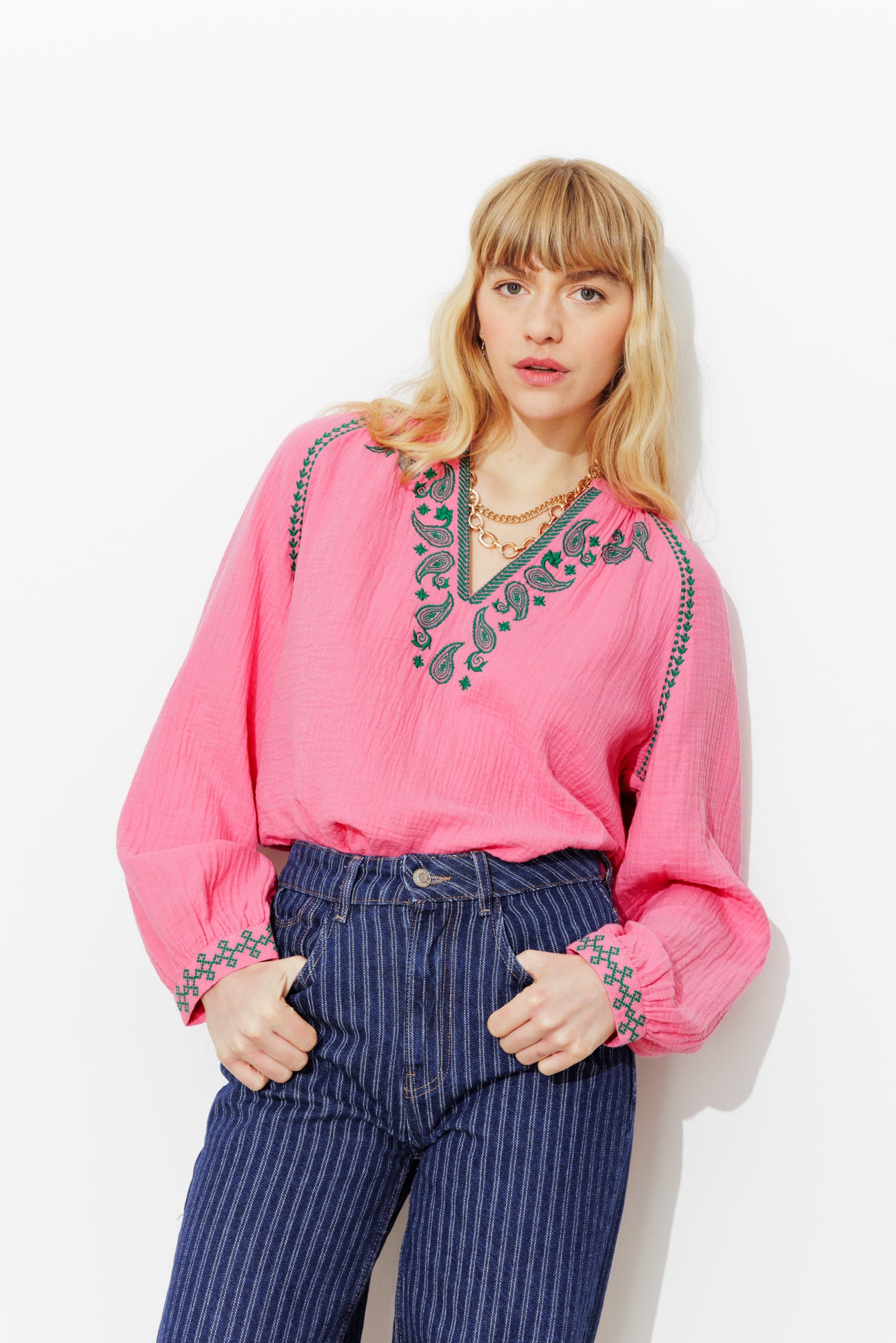 CAPO BASIC. La blusa GINGER, capo forte del guardaroba Promod, prende spunto dal folklore slavo ed è impreziosita da ricami paisley su garza di cotone. Colletto alla tunisina, giromanica raglan, maniche lunghe a sbuffo, polsini ricamati, fondo stondato e finiture cucite. Questa blusa contiene cotone biologico, coltivato senza pesticidi, fertilizzanti chimici né OGM.