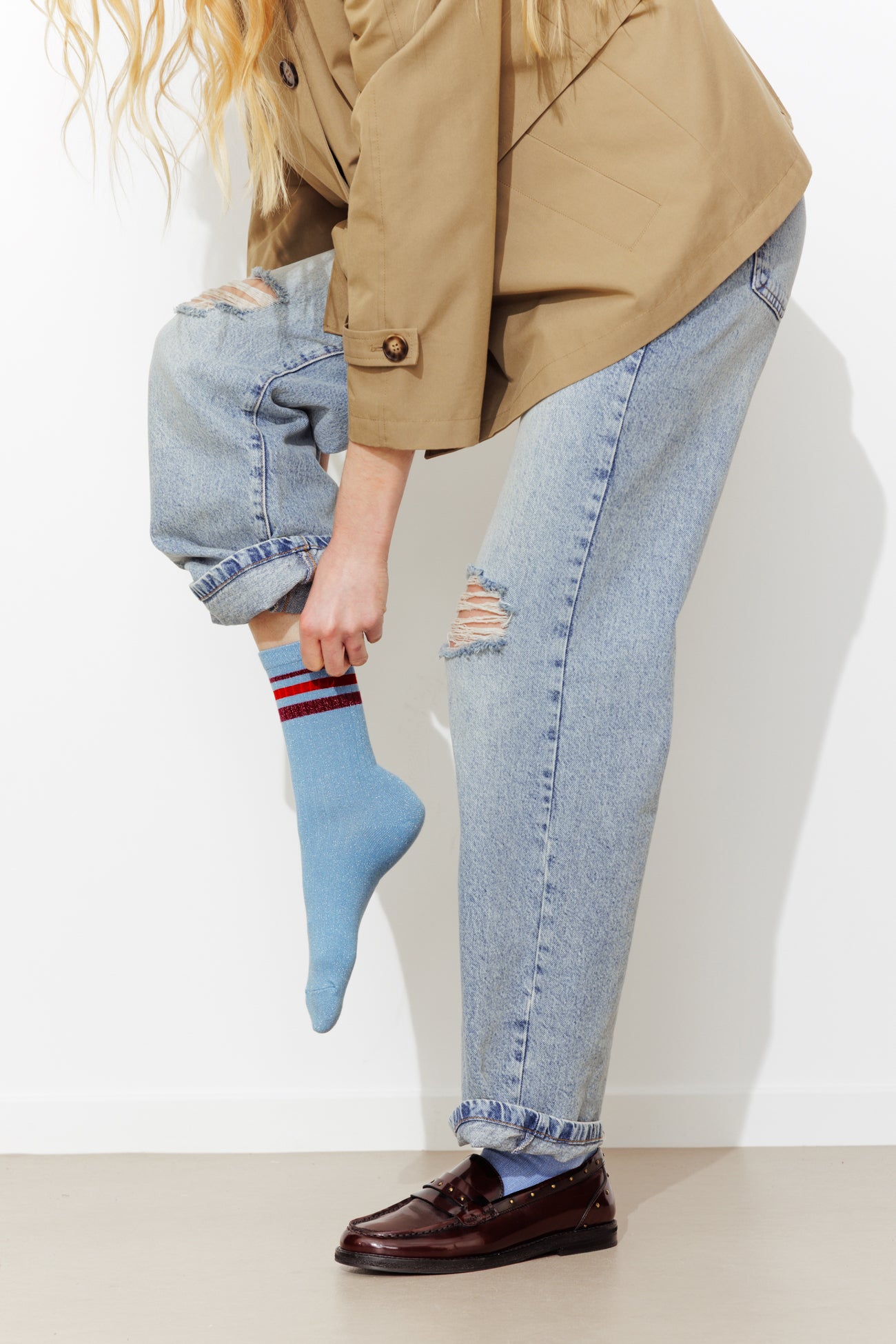 Calzini a coste e a righe disponibili in versione glitterata: sono pop, allegri e super trendy. Da sfoggiare e indossare con mocassini, scarpe da barca, derby o stivaletti! Filato fine ed elasticizzato, arricchito da filati metallizzati. Tallone e punta rinforzati. Bordo a coste elasticizzato. Ottima idea regalo.