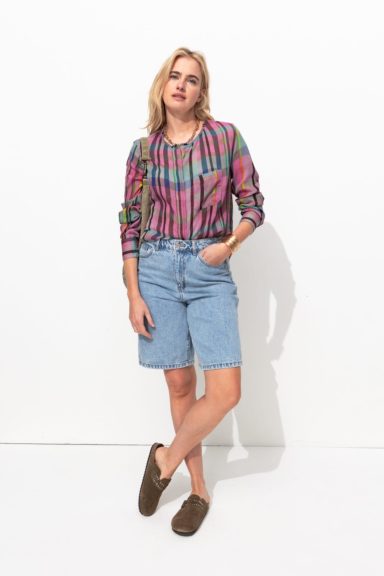 Camicia in 100% cotone leggero dall'effetto stropicciato per un look nuovo e chic! Abbinala a qualche bel bijou e indossala infilata nei pantaloni (o meno). 1Linea dritta, colletto tondo, abbottonatura frontale nascosta sotto una pattina, taschino sul petto, maniche lunghe, polsini con bottone, fondo stondato e finiture cucite tono su tono.