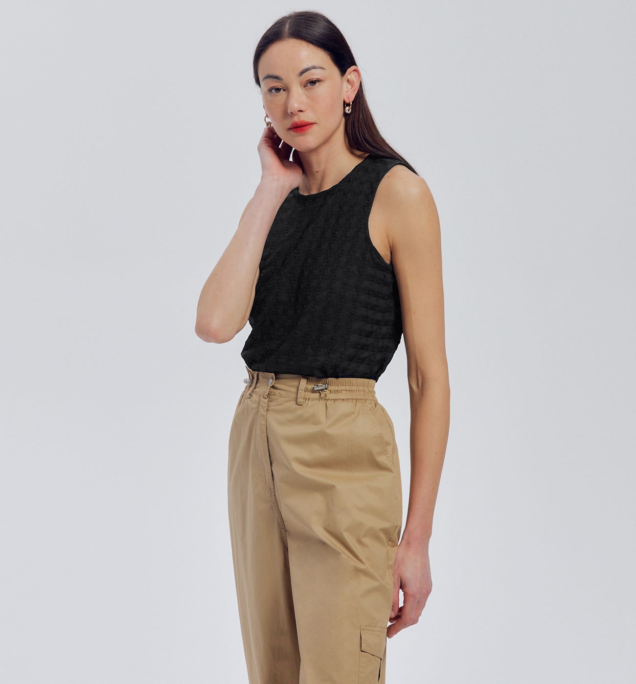 Questa stagione, la fantasia la fa da padrona come dimostra questa canotta in comodo jersey leggermente stretch a tinta unita che non mancherà di attirare gli sguardi grazie al suo effetto a onde in rilievo. Linea dritta. Scollo tondo. Giromanica all'americana. Fondo ondulato, punto bourdon. Cuciture tono su tono.