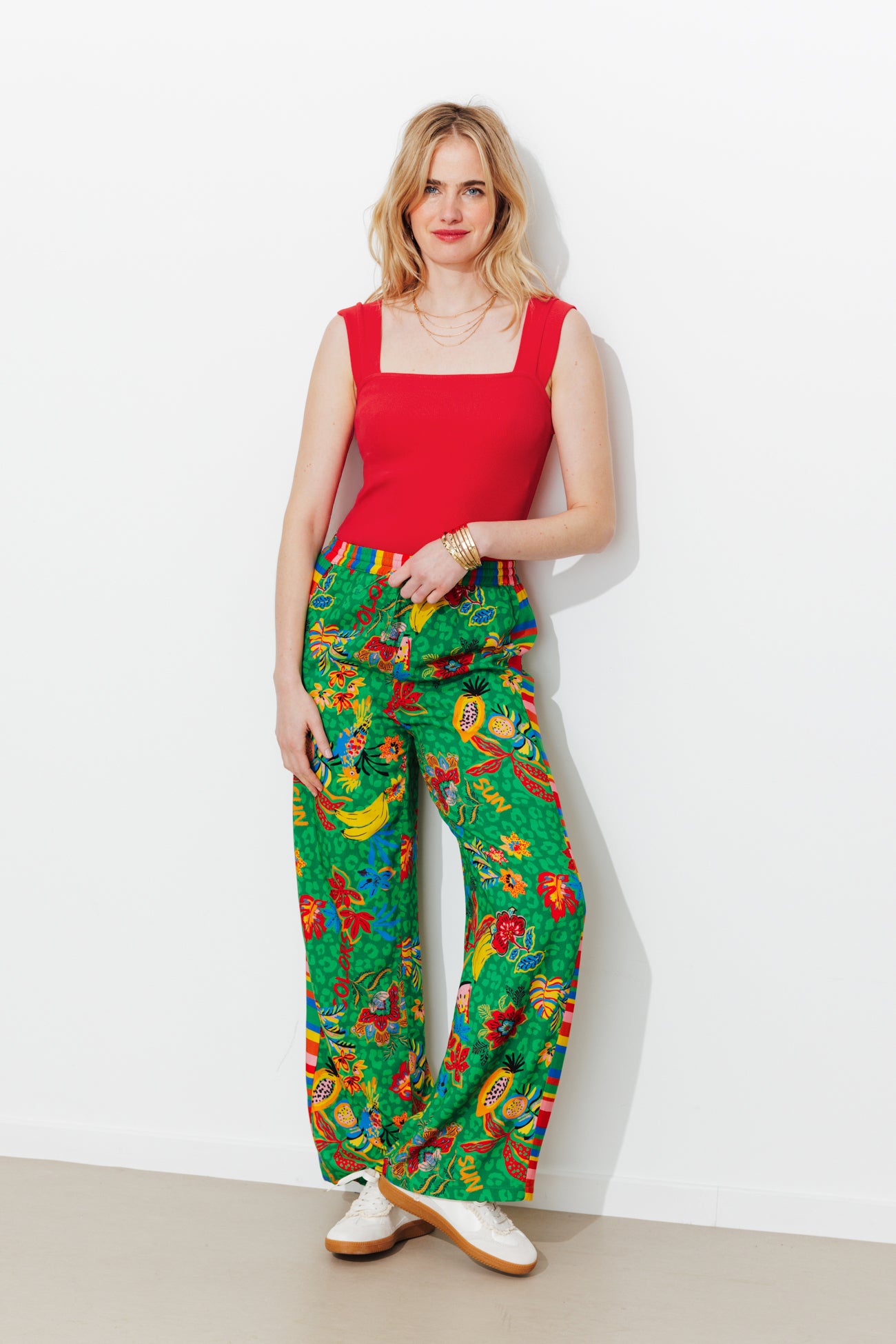 Se desideri un pizzico di allegria e stile, questi pantaloni in morbido tessuto fluido a stampa fantasia all over sono perfetti. Linea ampia, stile homewear, lunghezza alla caviglia, vita semi alta arricciata con elastico e coulisse. Finiture cucite. Questi pantaloni sono realizzati in 100% viscosa ricavata dalla polpa di legno proveniente da foreste gestite in modo sostenibile.
