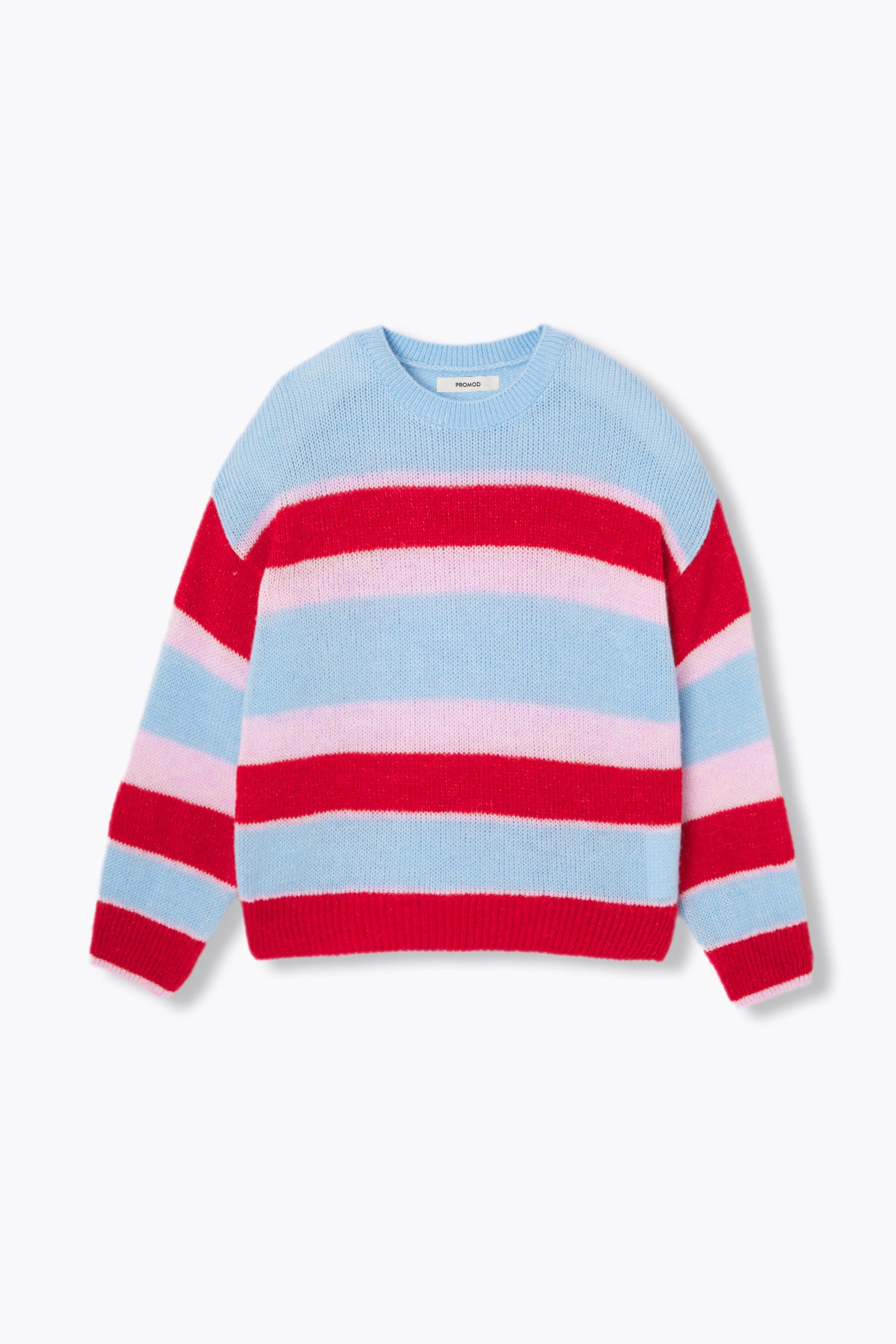 Pullover oversize a larghe righe colorate da abbinare a tutti i jeans della collezione, da valorizzare con una borsa e da sfoggiare con un berretto per un tocco particolare. Morbido filato, linea ampia e corta, girocollo a costine, giromanica basso, maniche lunghe, fondo dritto e bordi a costine. Contiene poliestere riciclato.