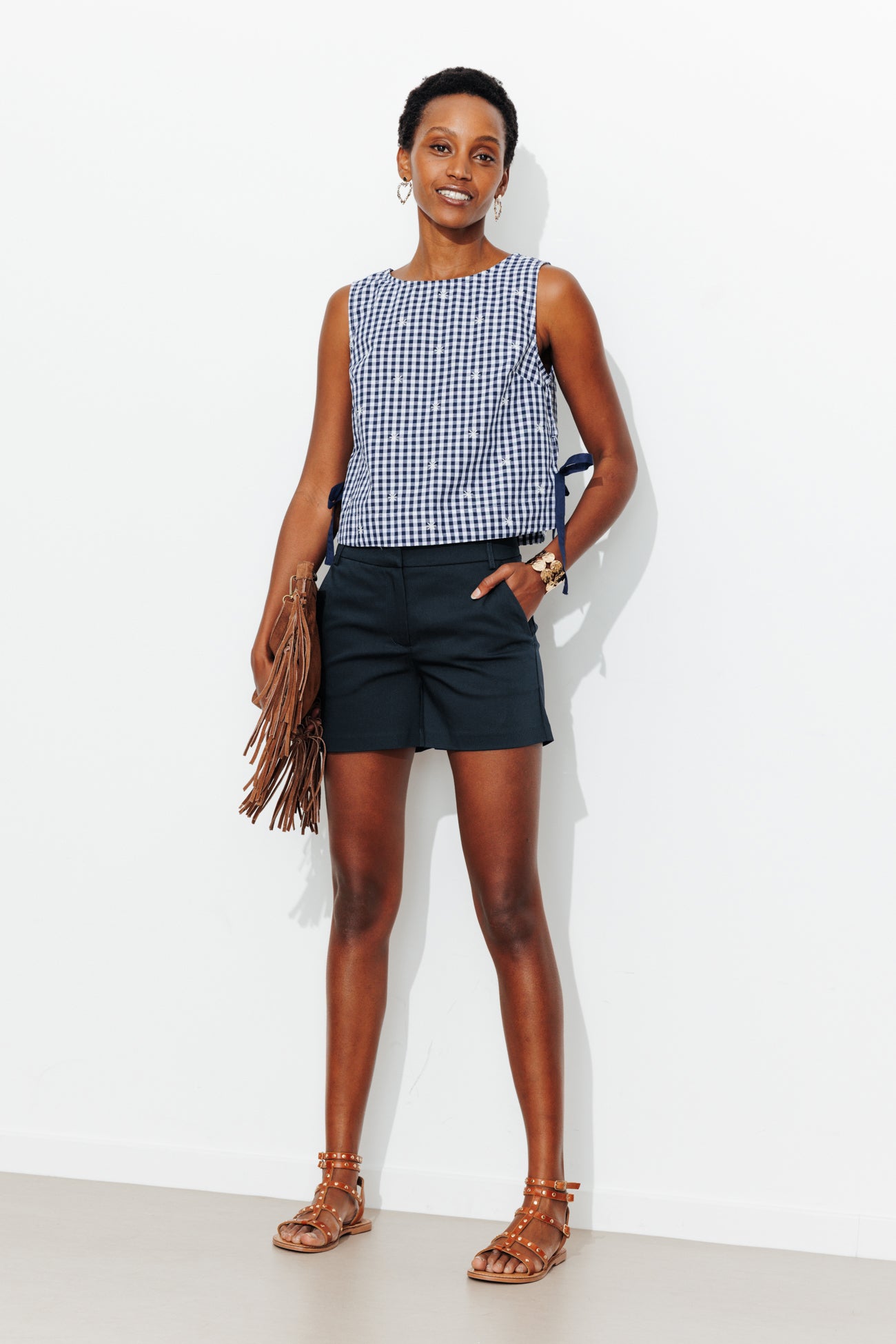 Questi shorts in misto cotone satinato, morbido e leggermente stretch, piacevole da indossare, indossabili la sera con i collant, aggiungono un tocco chic al look, in qualsiasi stagione, in qualsiasi momento. Fascetta in vita, passanti, chiusura con zip, bottone e gancetti, 2 tasche alla francese e 2 finte tasche sul retro. Cuciture tono su tono.