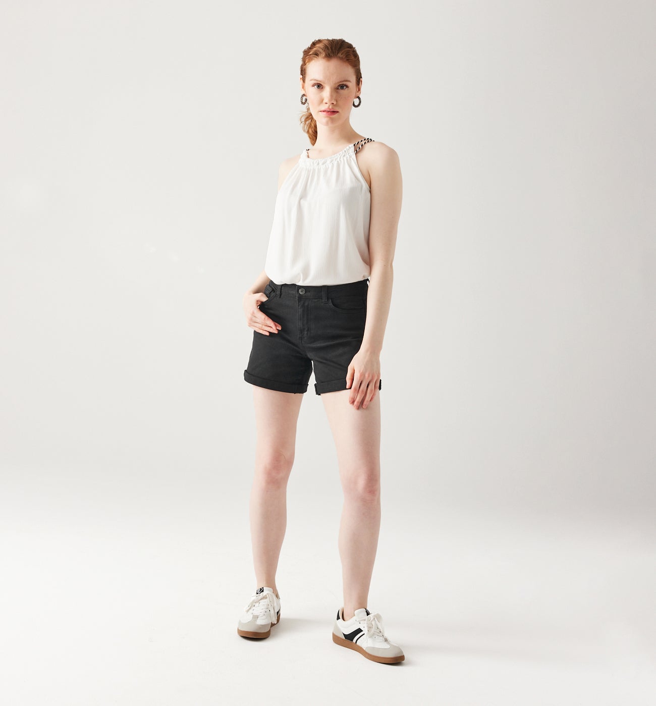 Shorts in tela abbinabili a una T-shirt bianca, a una camicetta a stampa fantasia o a una felpa. Vita regolare, passanti e bottone a chiodo e zip in metallo sul davanti. 5 tasche. risvolti regolabili. Articolo contenente fibre riciclate. Ricavate dai tessuti o dalla plastica oggetto di raccolta, le fibre riciclate vengono riutilizzate per creare nuovi capi.