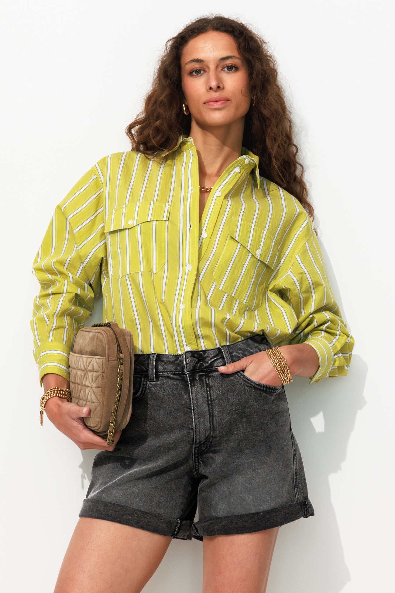 Gli shorts in denim bianco preannunciano un'estate divertente e soleggiata: impossibile farne a meno! Abbinali a tutti i top della stagione e indossali con le sneakers, con i sandali rasoterra o con gli zoccoli. Denim bianco, morbido e leggermente stretch. Chiusura con bottone a chiodo e zip in metallo sul davanti. 5 tasche. Risvolti regolabili e impunture a contrasto. Contengono cotone riciclato.