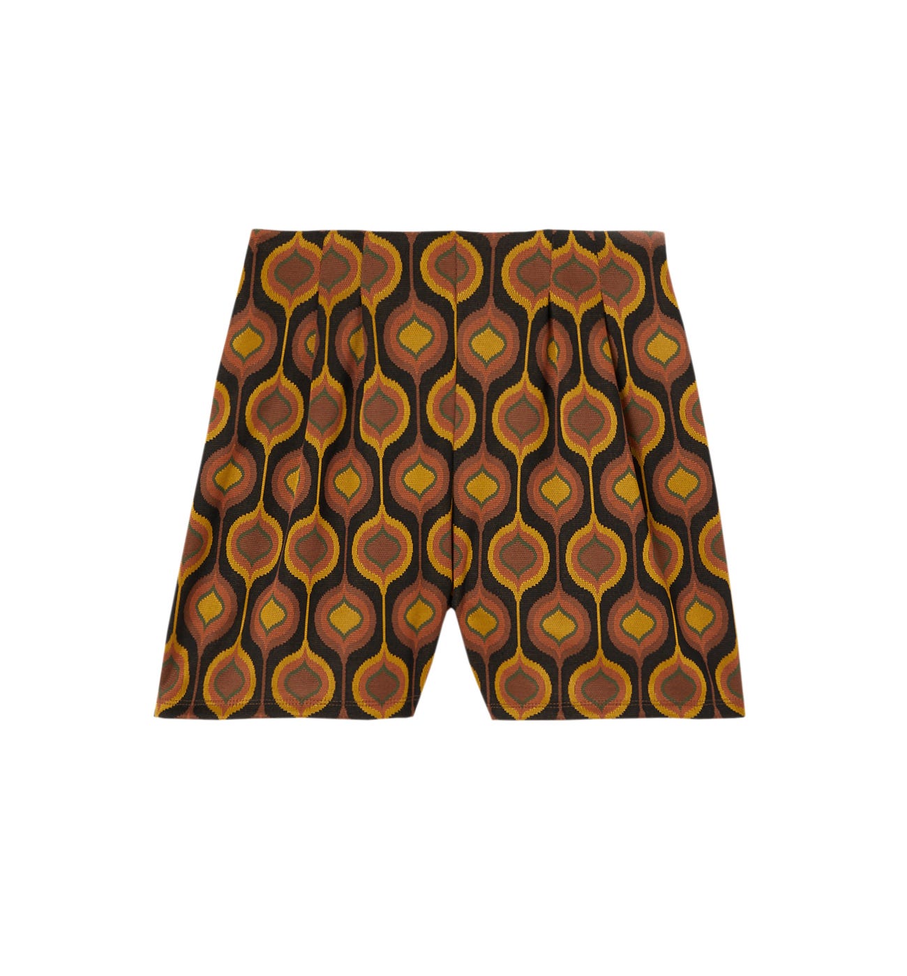 Look anni Settanta per questi shorts a fantasia jacquard da indossare, ad esempio, con un top a tinta unita per smorzarne l'effetto. Da portare con gli stivali, le snerakers o i mocassini, a seconda del tuo stato d'animo! Realizzati in jersey Milano, tessuto confortevole e leggermente stretch, hanno vita alta con elastico, pieghe sul davanti e finiture cucite.