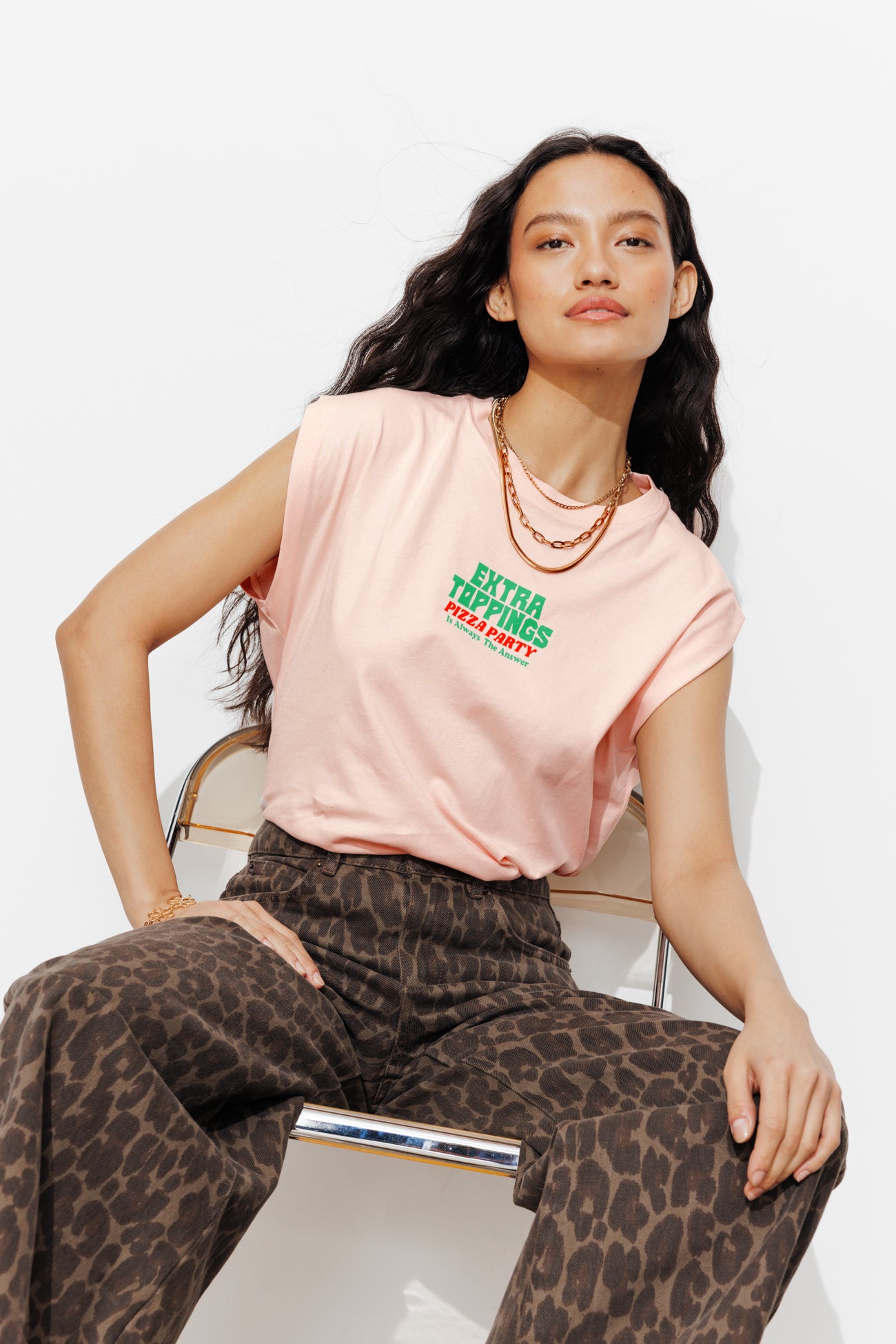 Avviso a tutte le fan italiane: è l'ora di un bel pizza party! Ne è la riprova questa T-shirt in morbido jersey con slogan (stampato sul petto) e grande motivo sul retro! Vestibilità oversize, girocollo a costine, giromanica all'americana e fondo dritto impunturato. Questa T-shirt da donna è realizzata con 100% cotone biologico, coltivato senza pesticidi, fertilizzanti chimici né OGM per preservare la biodiversità.