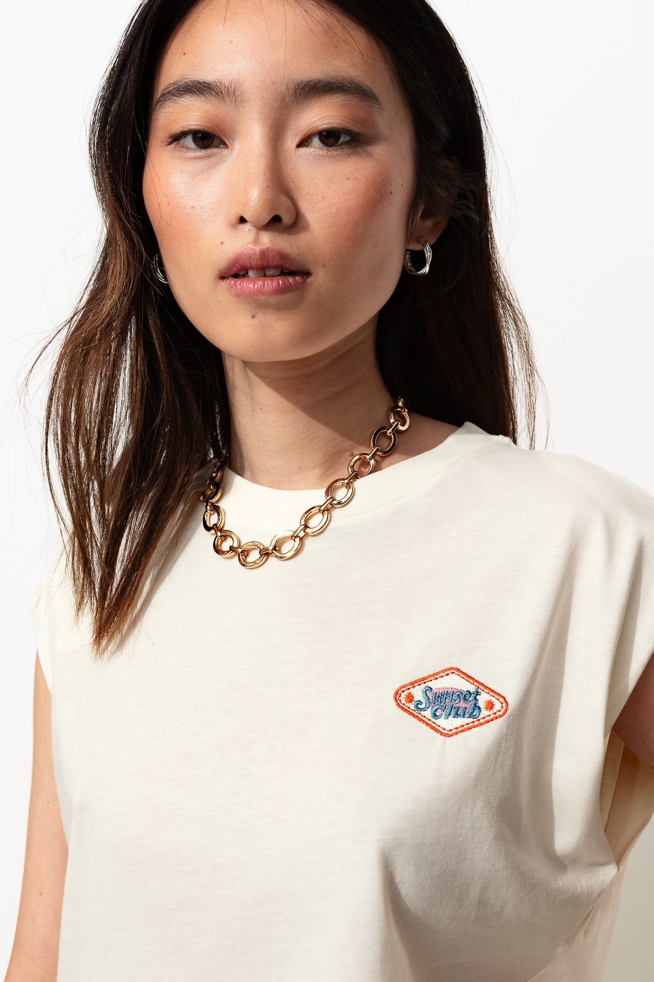 Tocco anni '90 e spirito californiano: questa T-shirt girocollo con giromanica all'americana fa la differenza grazie allo stemma ricamato sul petto. Morbido jersey di cotone e linea e fondo dritti. Contiene cotone proveniente da agricoltura biologica, coltivato senza pesticidi, fertilizzanti chimici né OGM.