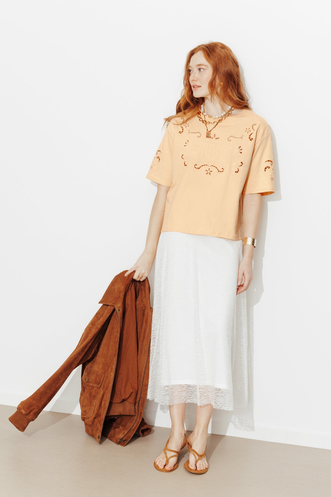 Ricami, trafori e un messaggio da trasmettere: JOY per tutti con questa T-shirt semplice e originale in morbido jersey 100% cotone, impreziosita dal ricamo a punto inglese sul davanti e sulle maniche. Vestibilità ampia, girocollo a costine, maniche corte, fondo dritto e cuciture tono su tono. Questa T-shirt da donna è realizzata in cotone 100% biologico, coltivato senza pesticidi, fertilizzanti chimici né OGM per preservare la biodiversità.