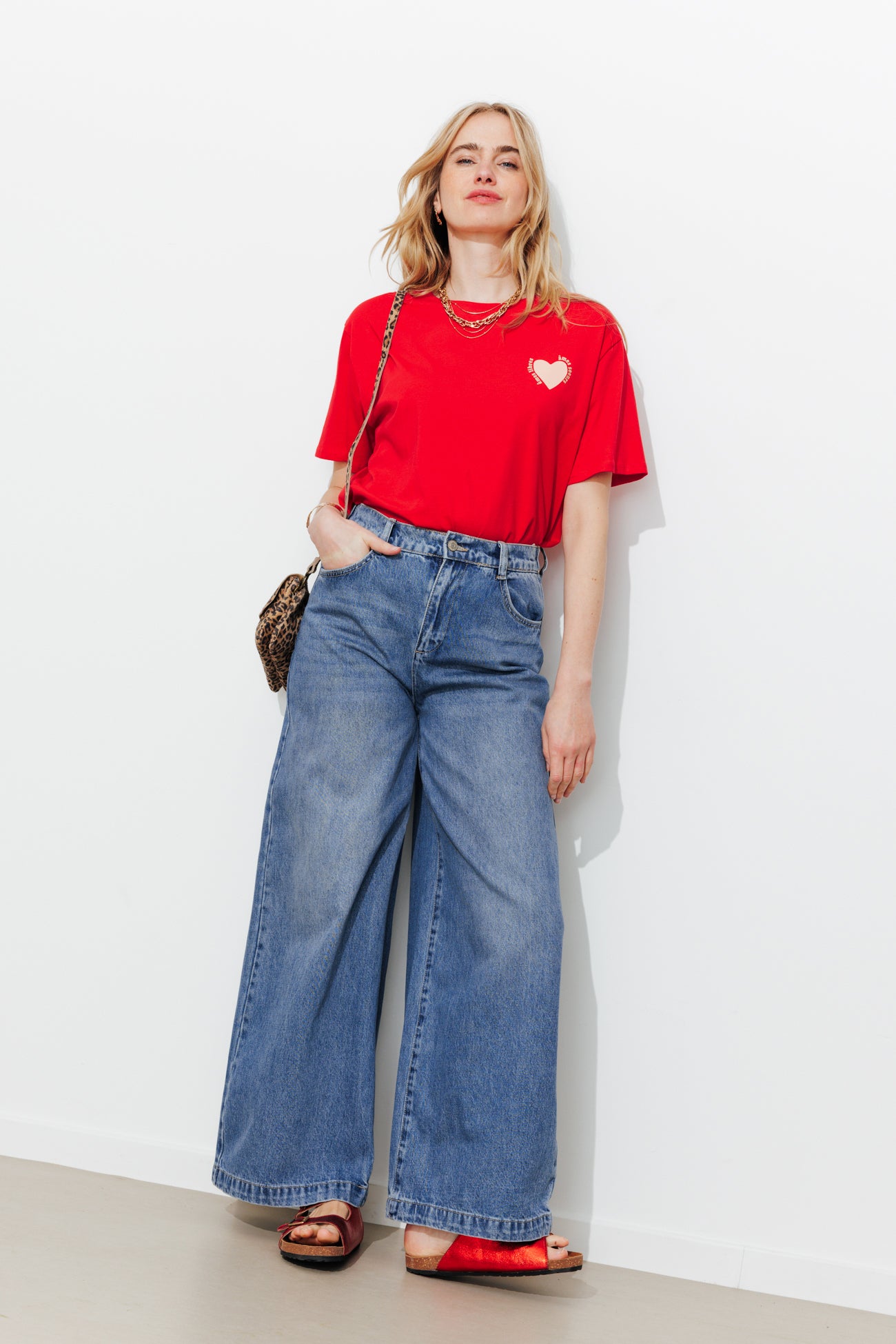 T-shirt girocollo in morbido jersey, dalla vestibilità oversize e manica corta impreziosita dallo slogan "Âmes sœurs, âmes libres" ("Anime gemelle, anime libere") e da un cuore stampato e scritto sul petto e in grande sulla schiena. Da regalare (o regalarsi) al più presto! 100% cotone biologico, coltivato senza pesticidi, fertilizzanti chimici né OGM.