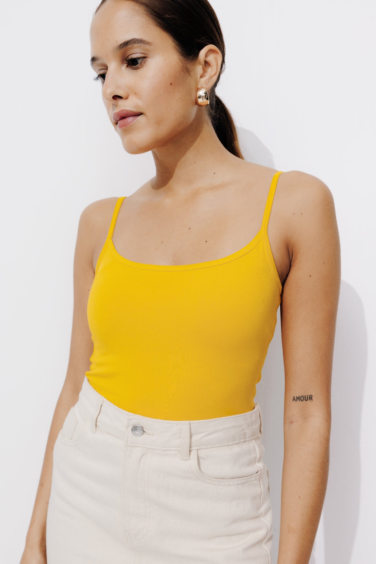 Questo top in morbido jersey di cotone leggermente stretch con spalline sottili è perfetto sia sotto il sole che sotto una bella maglia calda! Linea corta e aderente. Prodotto di eco design pensato per ridurne l’impatto ambientale, fin dalla fase di progettazione e in ogni fase del suo ciclo di vita (scelta delle materie prime, produzione, distribuzione, utilizzo e fine vita).