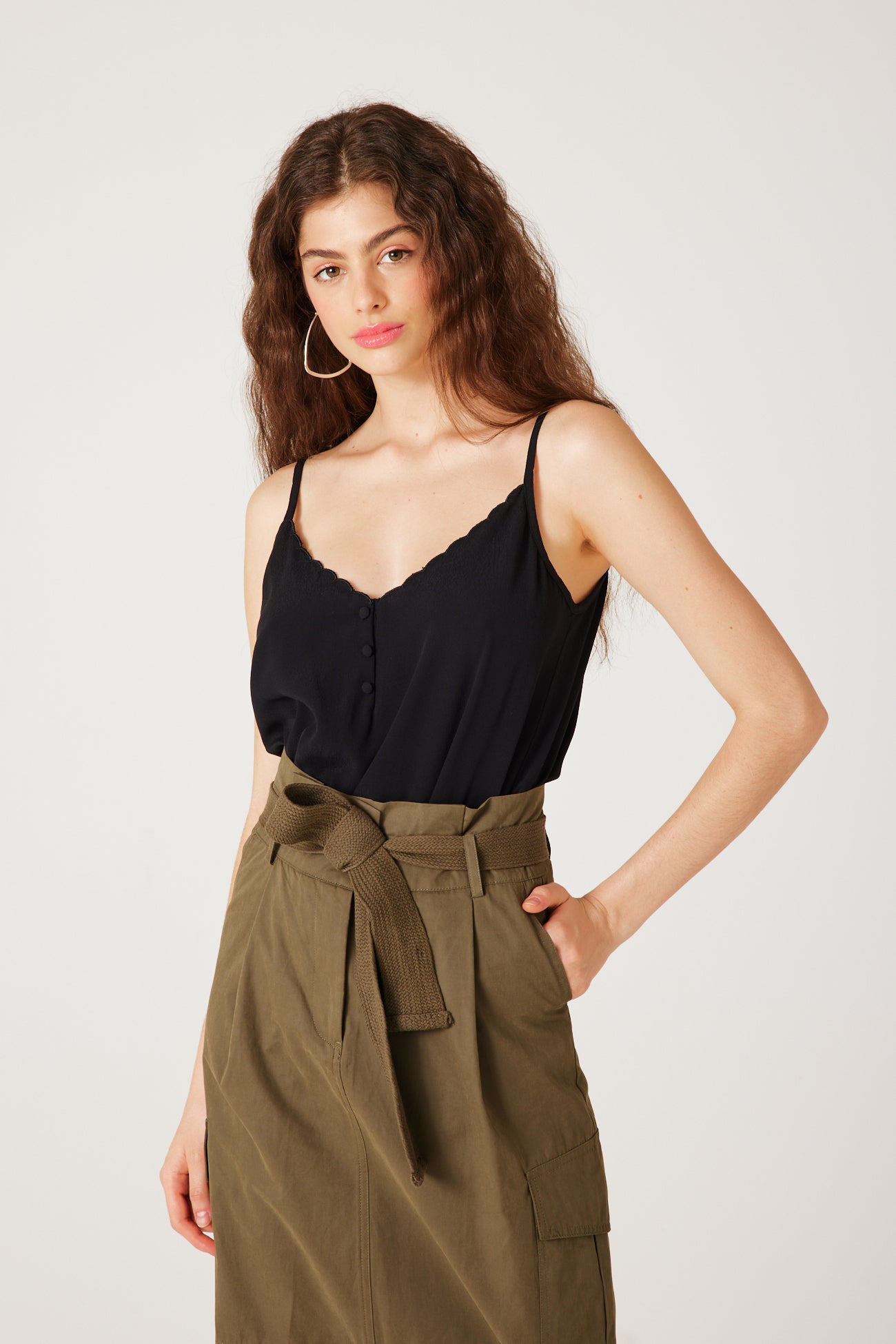 Questo top ha un occhio di riguardo per i dettagli: scollo a V con bordi smerlati sul davanti, bottoncini rivestiti e sottili spalline regolabili. Linea dritta, scollo a V davanti e dietro, fondo stondato e finiture cucite. Contiene viscosa ricavata da pasta di legno proveniente da foreste correttamente gestite.